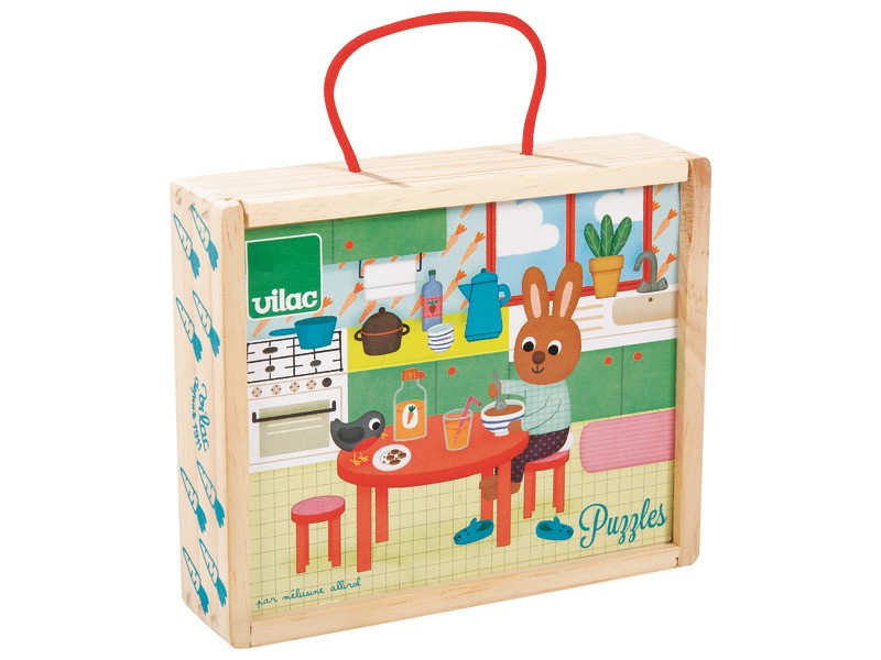 Coffret de 4 puzzles en bois de 6 pièces. Les puzzles relatent la journée d’un petit lapin: la nuit, où il dort dans son petit lit avec son ami l’oiseau, le petit déjeuner où il mange en compagnie de l’oiseau, le bain et, enfin un moment de détente où il lit confortablement dans son salon. […]