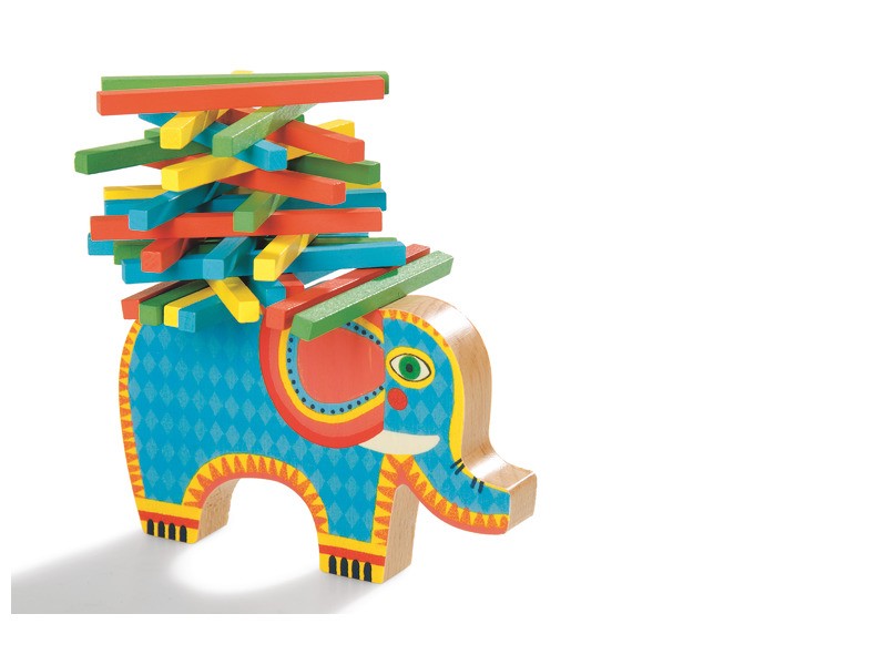 Jeu d’équilibre et d’adresse dont le but est d’empiler les bâtons de couleurs sur le dos de l’éléphant sans qu’ils ne tombent. Composition : 1 éléphant (base) et 32 bâtonnets. Dimensions : L: 11,3 cm – H: 7,2 cm. Réalisé en : BOIS.